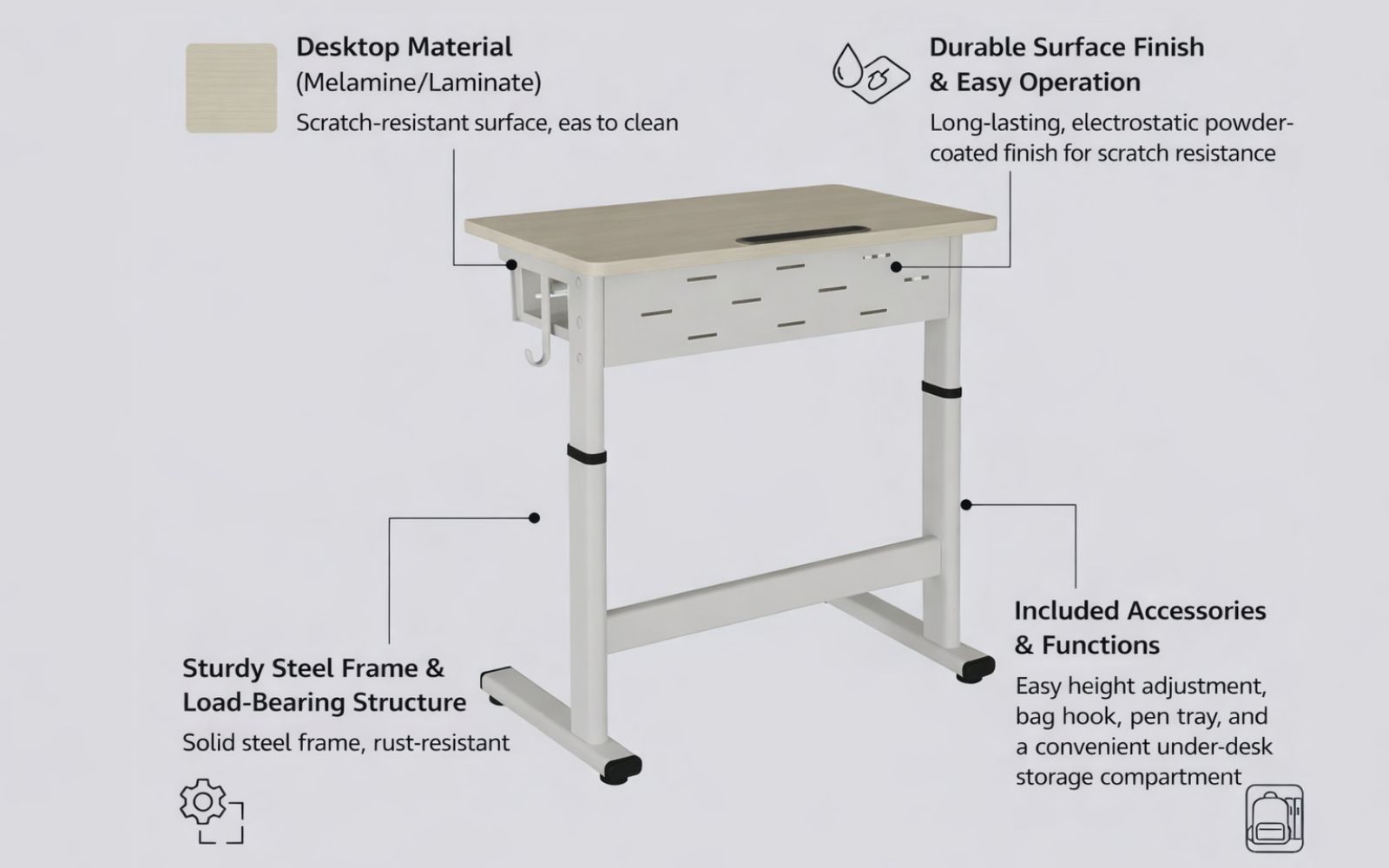 Accessories such as backpack hooks, storage compartments, safety-rounded edges, or pencil trays can affect desk pricing. These features, however, often enhance usability and safety, especially in high-traffic classroom environments.