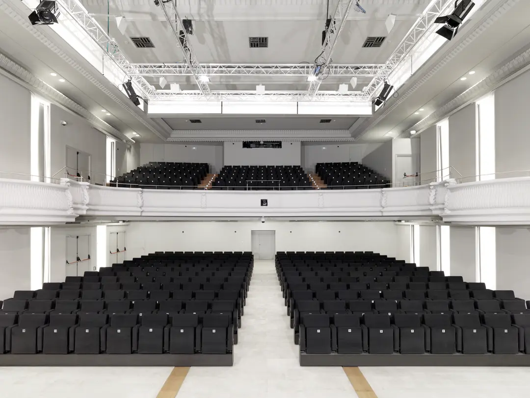 The foldable Astra 02 auditorium chair The automatic folding tiered seating system is a "2-in-1" solution for spaces that require both unobstructed views and flexible functional conversion. The seating structure is designed in tiers, creating progressively higher rows of seats, ensuring that those seated at the back always have an unobstructed view. This is ideal for multi-purpose halls, training rooms, performance areas, and sports arenas.