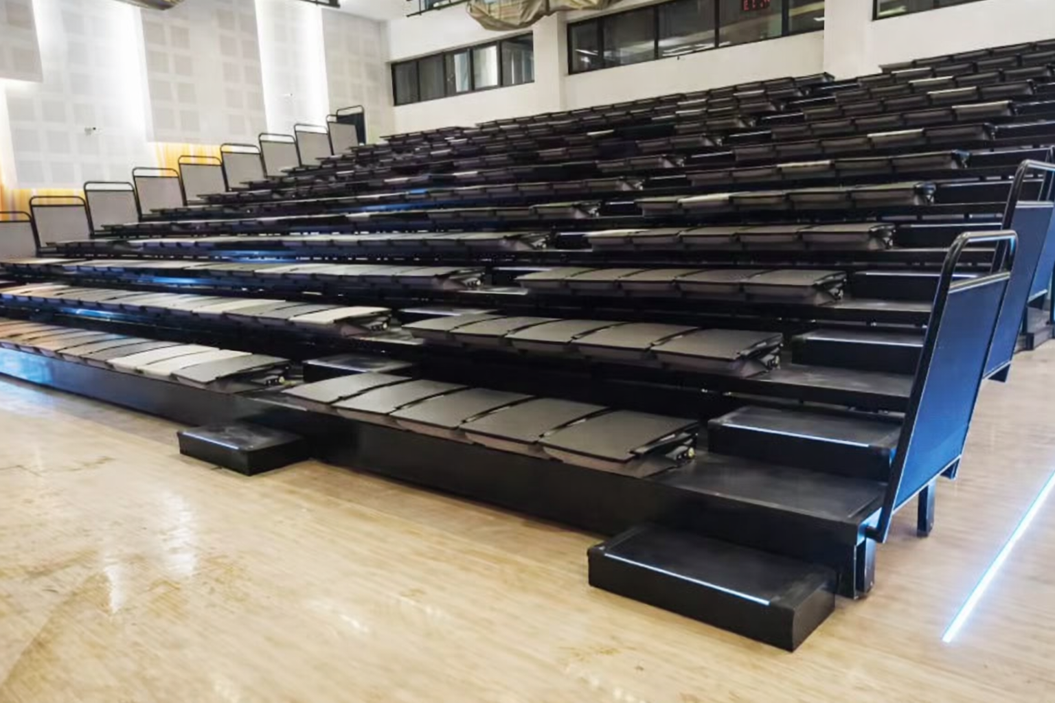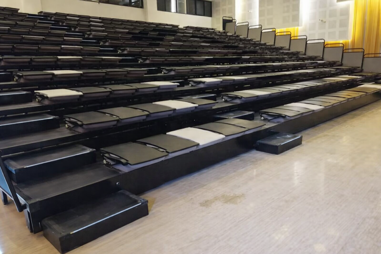 The Axion telescopic seating features a balanced design that blends technical performance with refined aesthetics. Its high backrest provides excellent support during long events, while the wooden backrest and armrests add a warm and professional appearance suitable for auditoriums and multi-purpose halls.