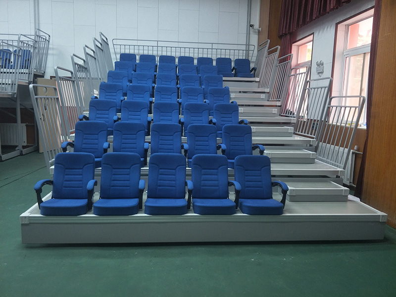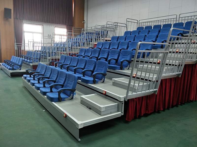 The Flexor 02 telescopic seating features a modern, compact design suitable for sports arenas, school auditoriums, and multi purpose halls. The high backrest combined with integrated armrests ensures comfort and stable seating during long events.