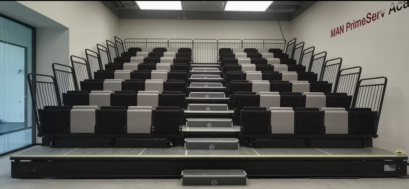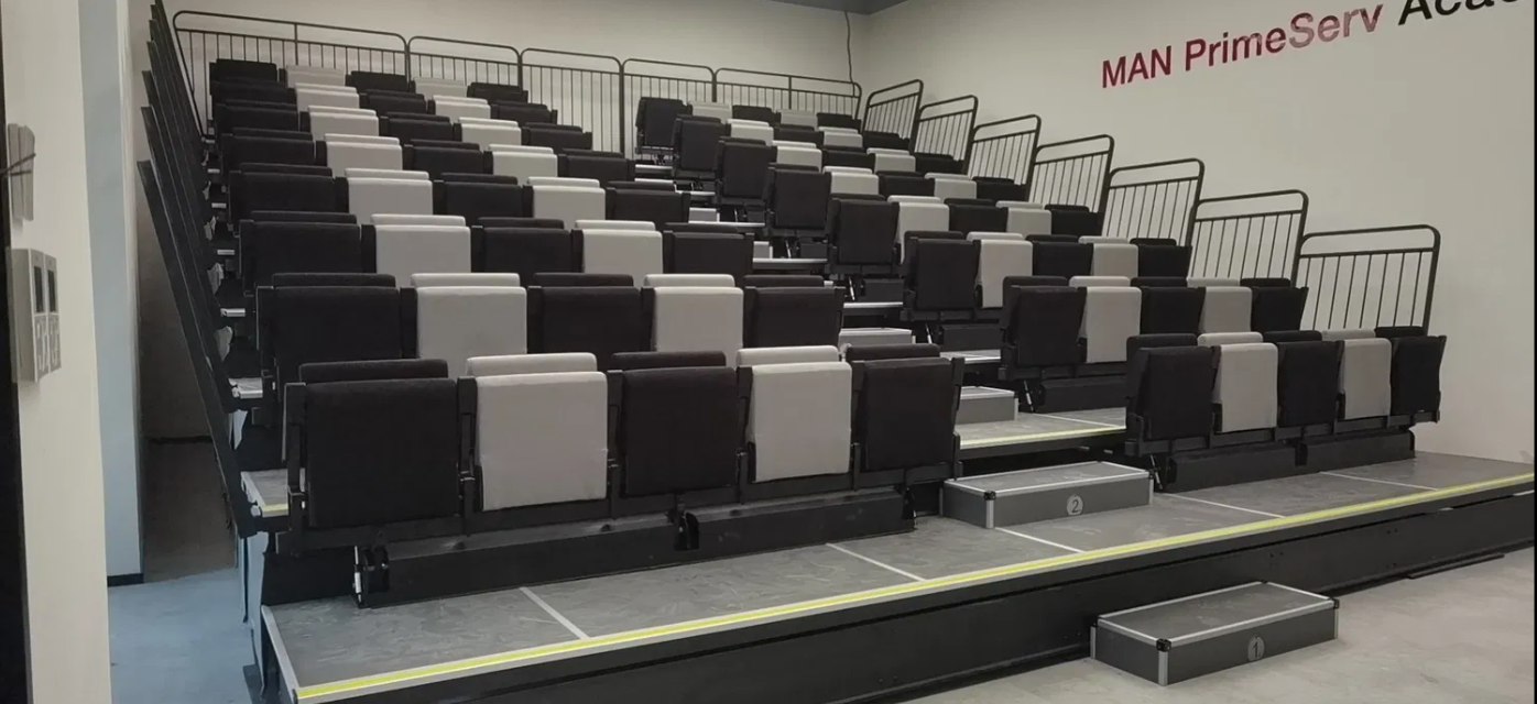 Revo telescopic seating features a compact and modern design, ideal for telescopic seating in sports halls, multipurpose auditoriums, and event venues. Its optimized structure ensures efficient operation and organized seating arrangement.