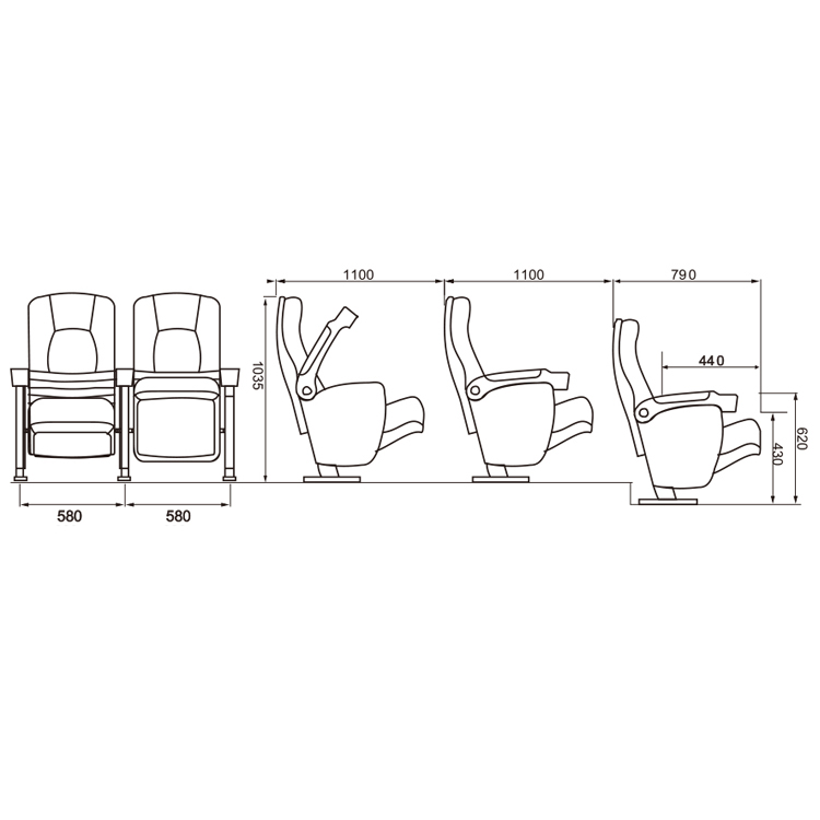 Ghế được cấu tạo từ khung sắt chịu lực cao, sơn tĩnh điện bền bỉ theo thời gian. Phần tựa lưng và nệm ngồi sử dụng mút đàn hồi cao bọc vải êm ái, mang lại sự thoải mái tối đa. Tay ghế làm từ polypropylene chất lượng cao, có độ bền tốt và dễ dàng vệ sinh, phù hợp với môi trường rạp phim.